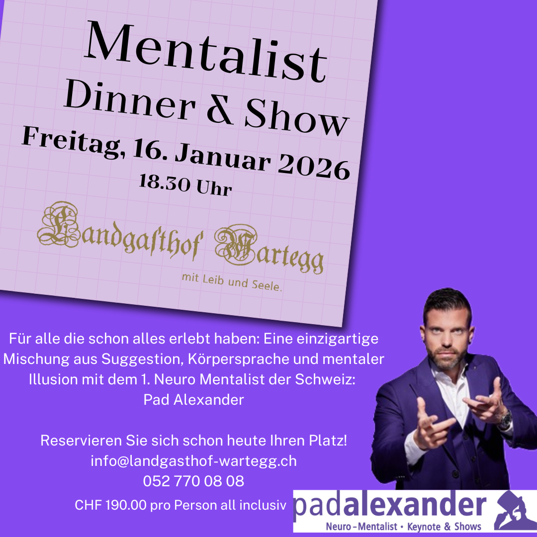 Für alle die schon alles erlebt haben: Eine einzigartige Mischung aus Suggestion, Körpersprache uind mentaler Illusion mit dem 1. Neuro Mentalist der Schweiz: Pad Alexander.