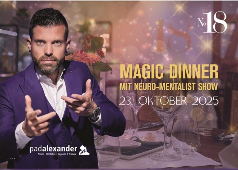 Ein Abend voller Magie und Genuss wartet beim Magic Dinner in Winterthur. Ein exklusives 4-Gänge-Menü verwöhnt alle Sinne, während kunstvolle Illusionen für staunende Augenblicke sorgen. Der preisgekrönte Neuro-Mentalist Pad Alexander präsentiert seine eindrucksvollen Showacts und lässt die Grenzen zwischen Realität und Illusion verschwimmen. Ein wervoller Moment, der die gemeinsame Zeit in etwas ganz Besonderes verwandelt.